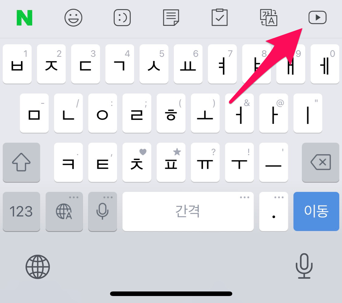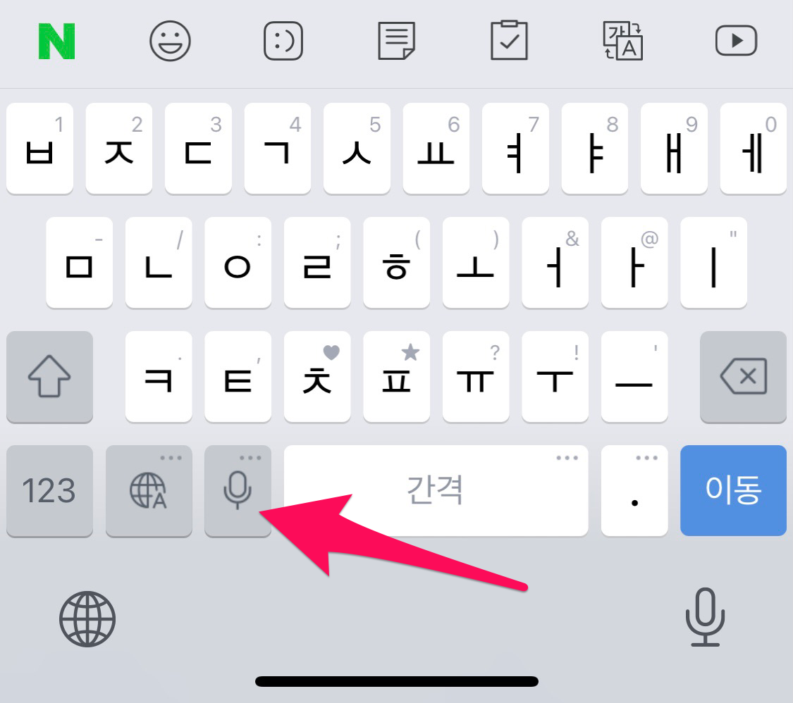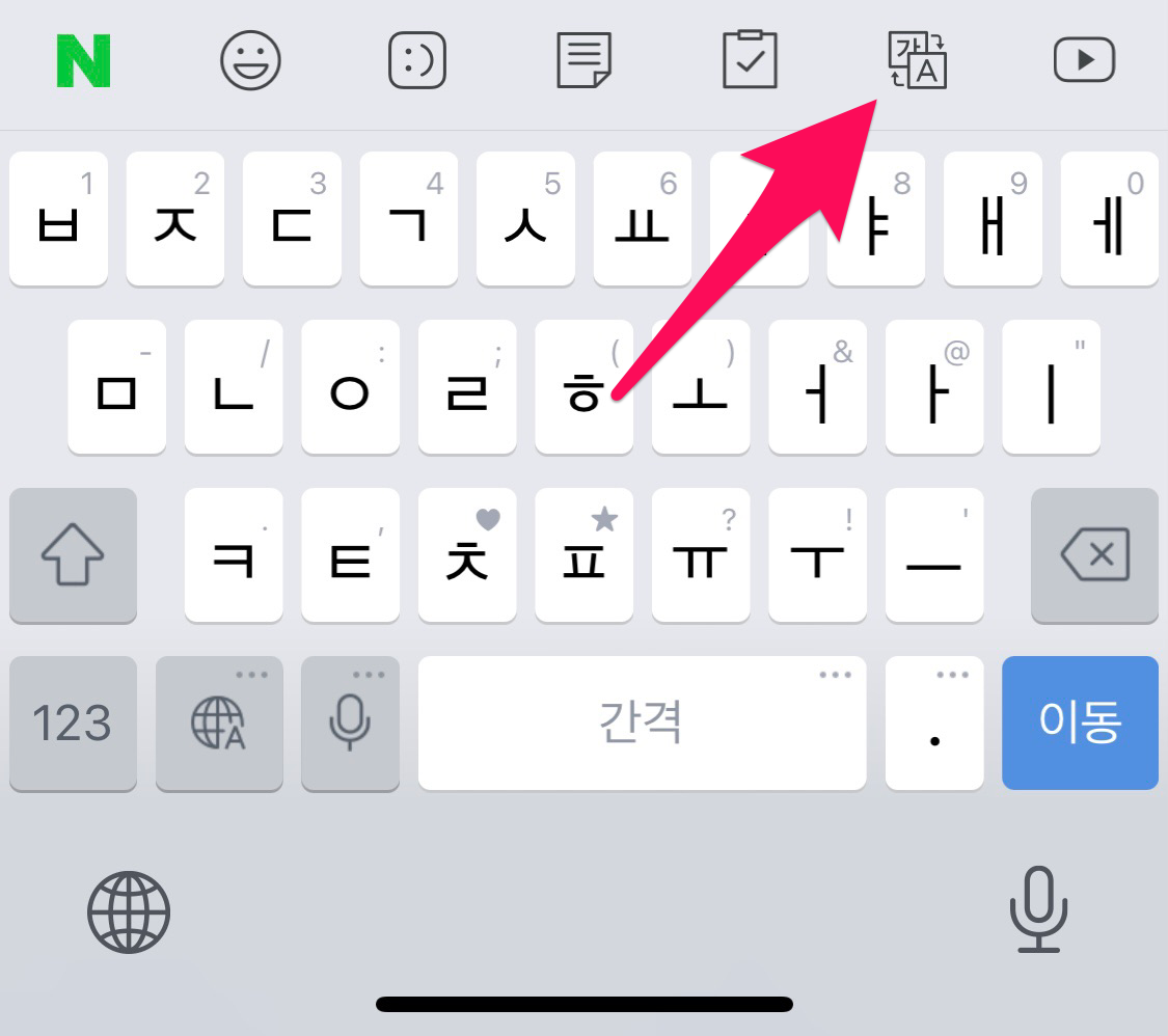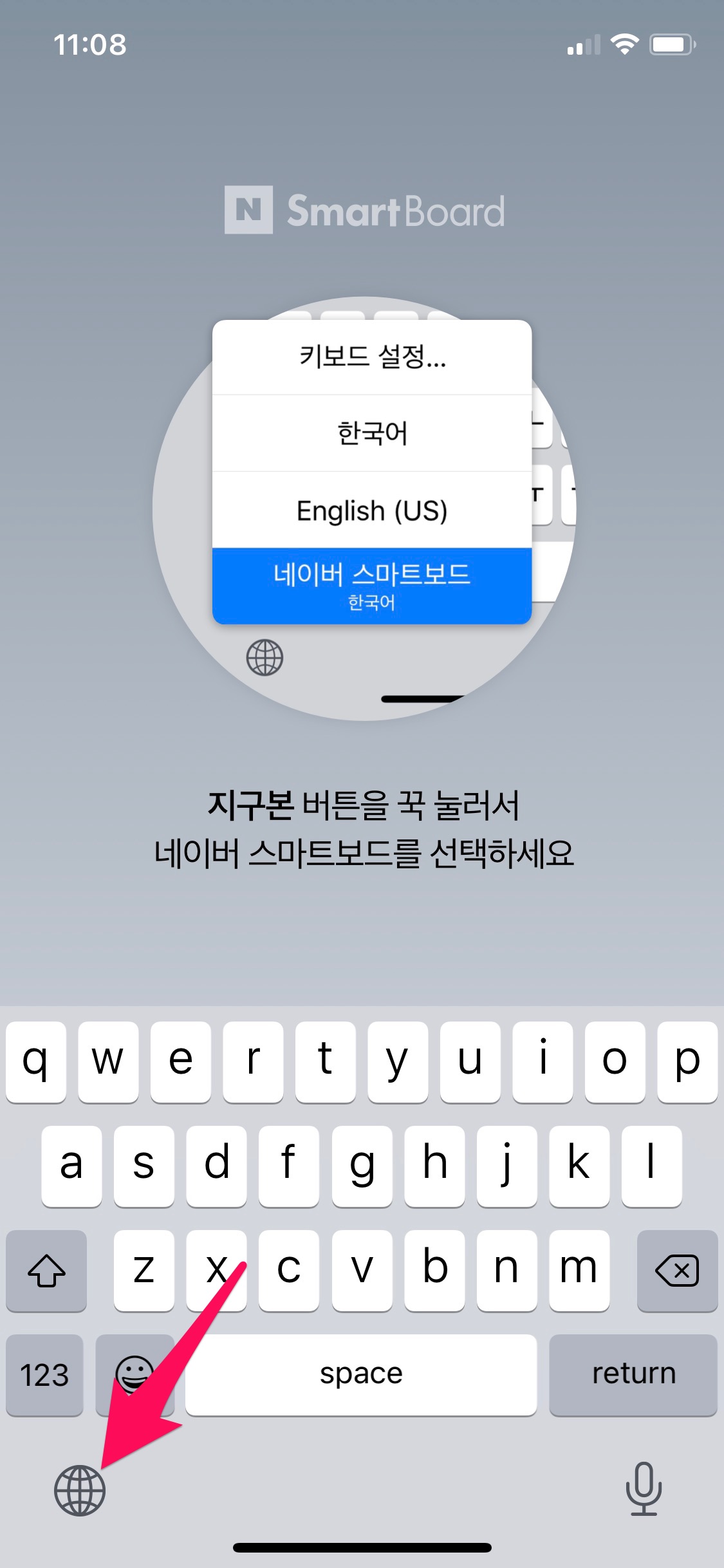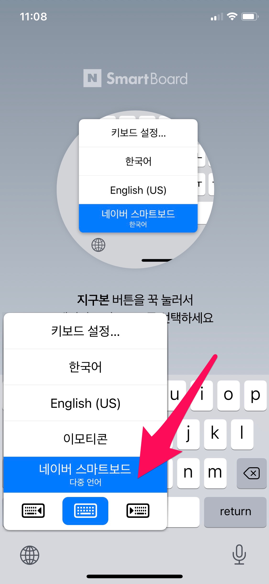 스마트폰 키보드에 지구본 버튼을 꾹 눌러서 네이버 스마트보드를 선택합니다.