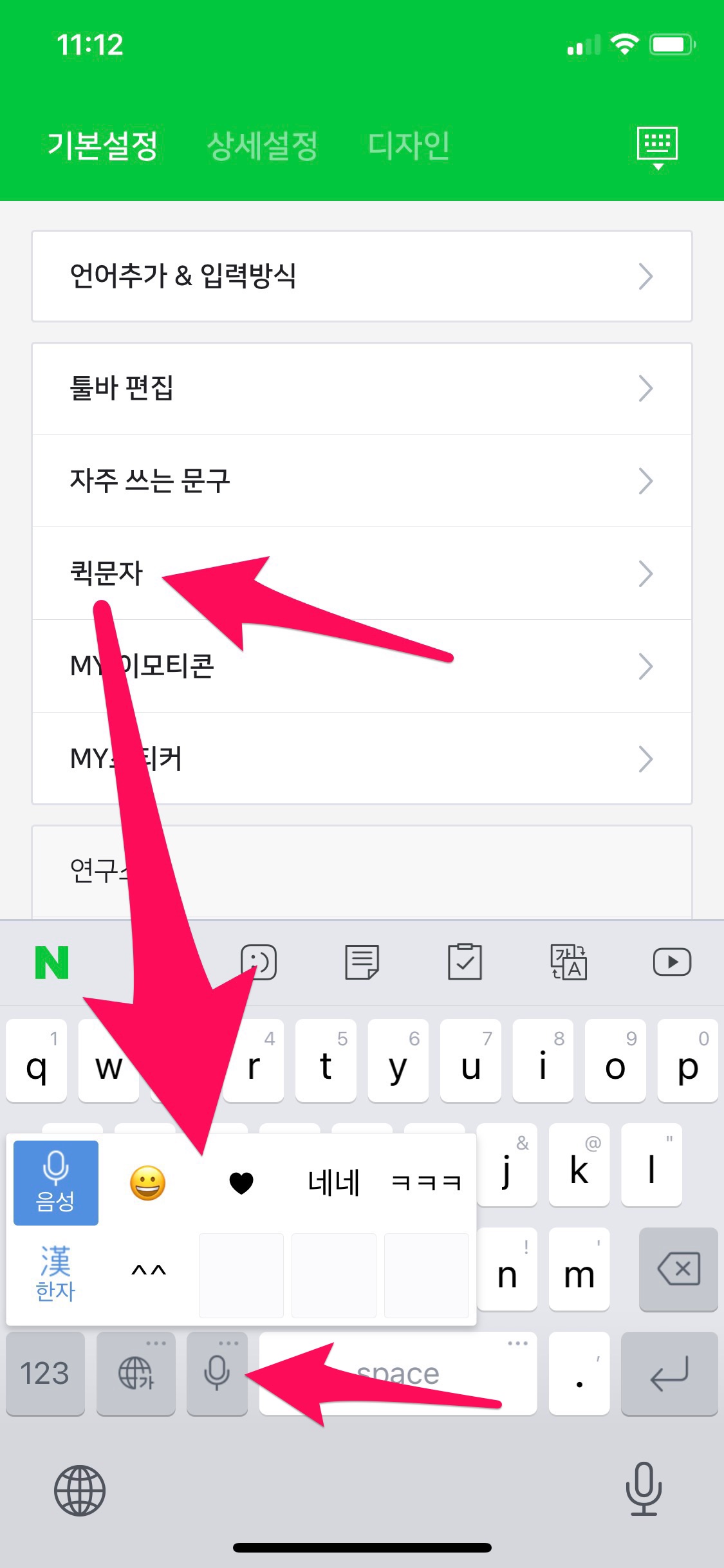 퀵문자도 최대 3글자로 해서 등록한 후에 키보드에서 마이크를 꾹~ 누르면 퀵문자로 바로 선택할 수 있습니다.