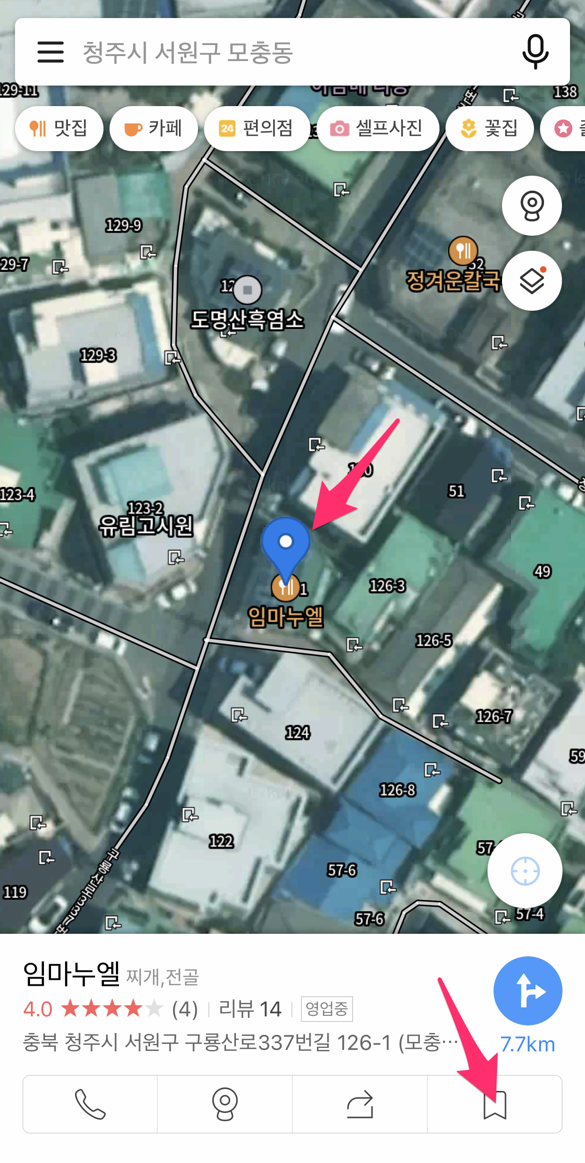 이제 여러분이 좋아하거나 가고 싶은 곳을 검색한 후에 오른쪽 하단에 즐겨찾기 아이콘을 선택하고 원하는 그룹을 선택합니다.