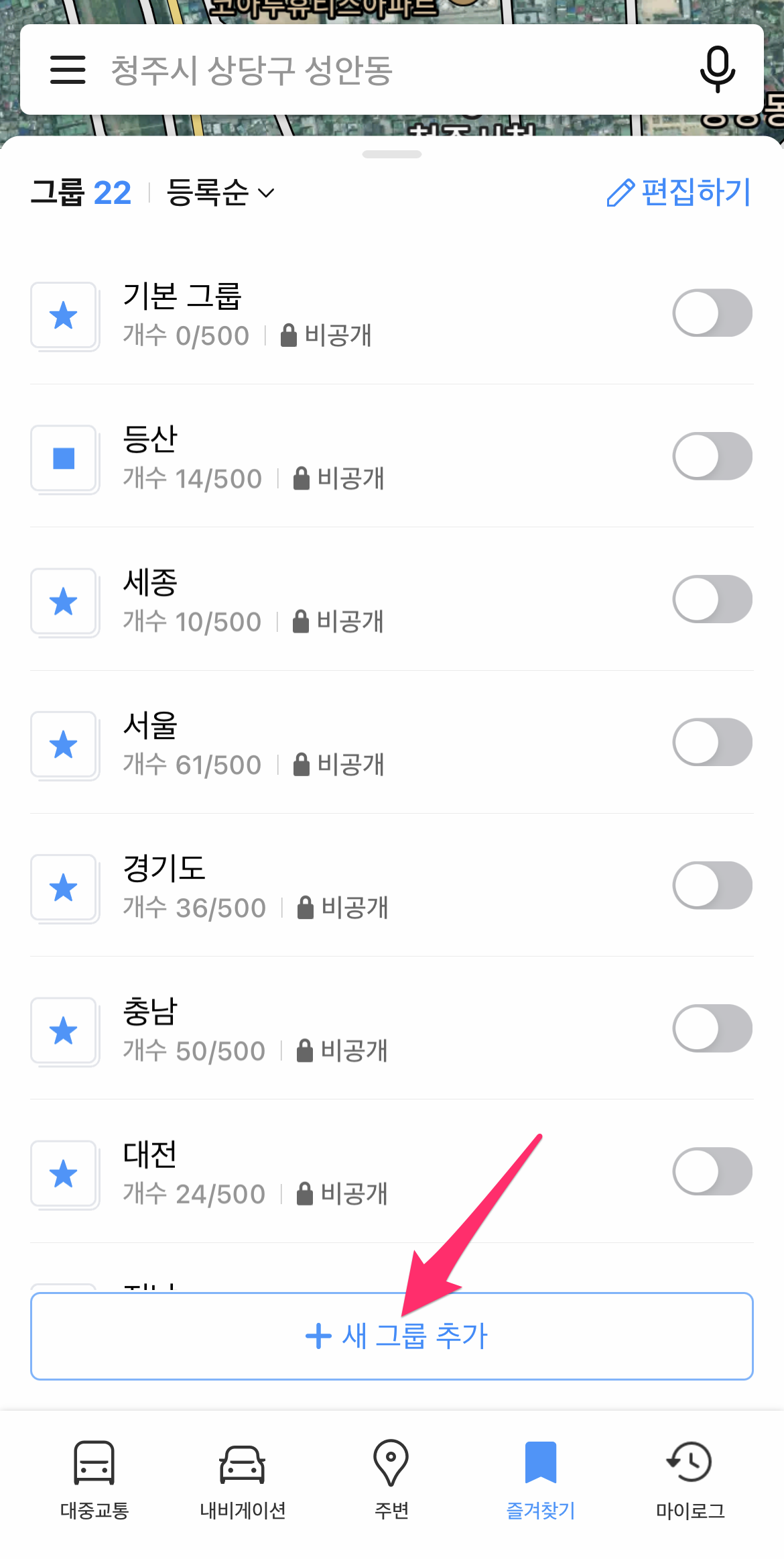 그룹마다 500개를 저장할 수 있기에 저는 지역별로 구분해서 저장했습니다.