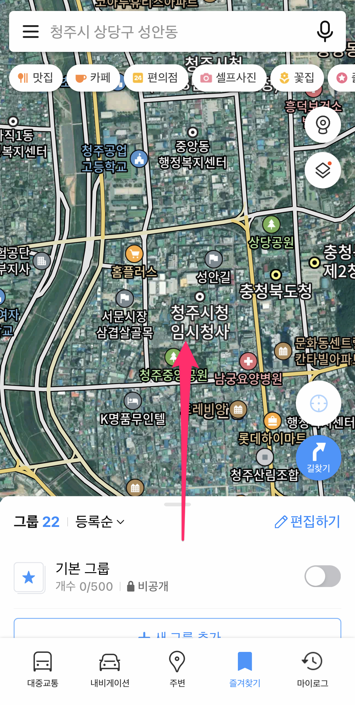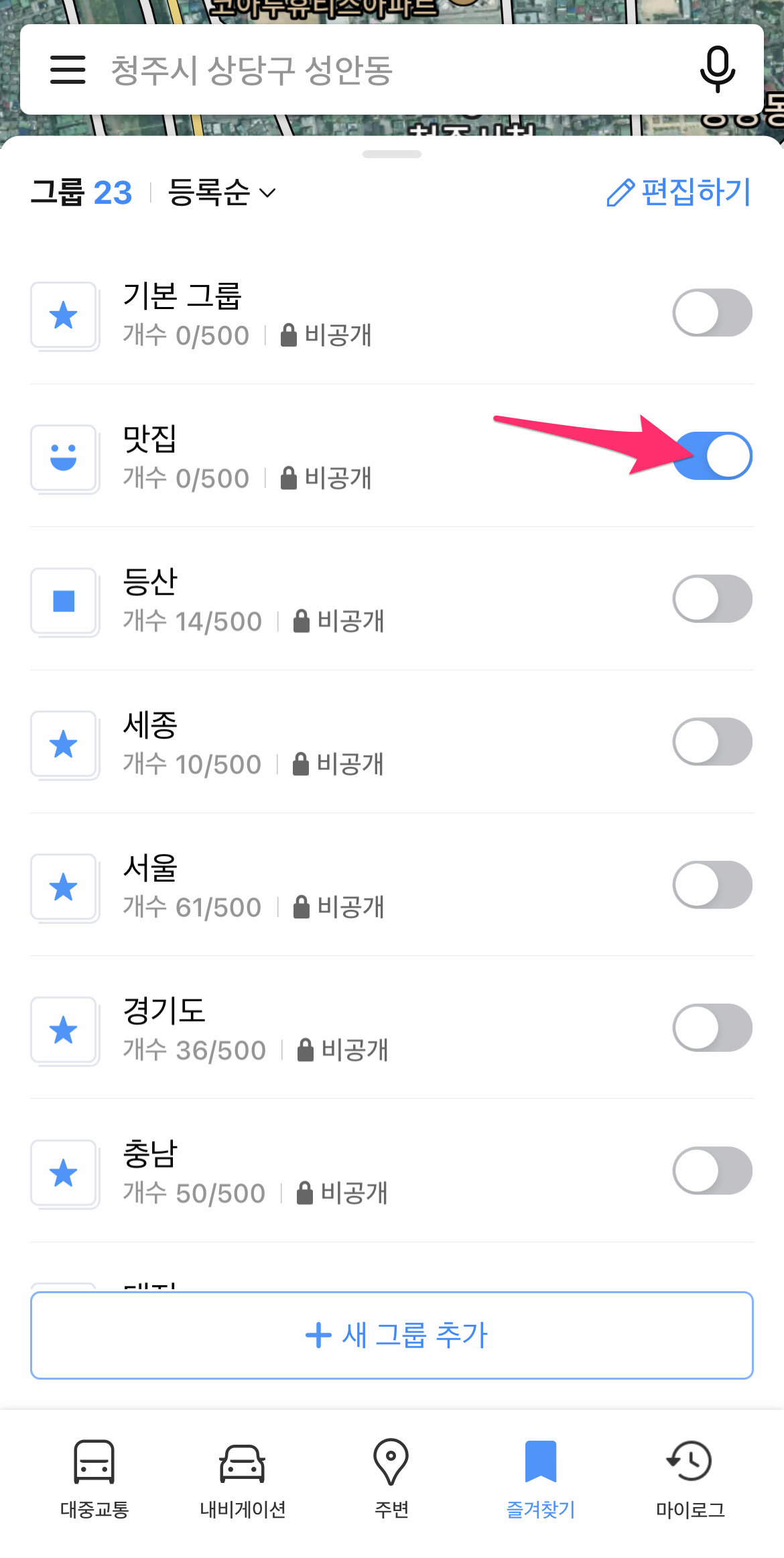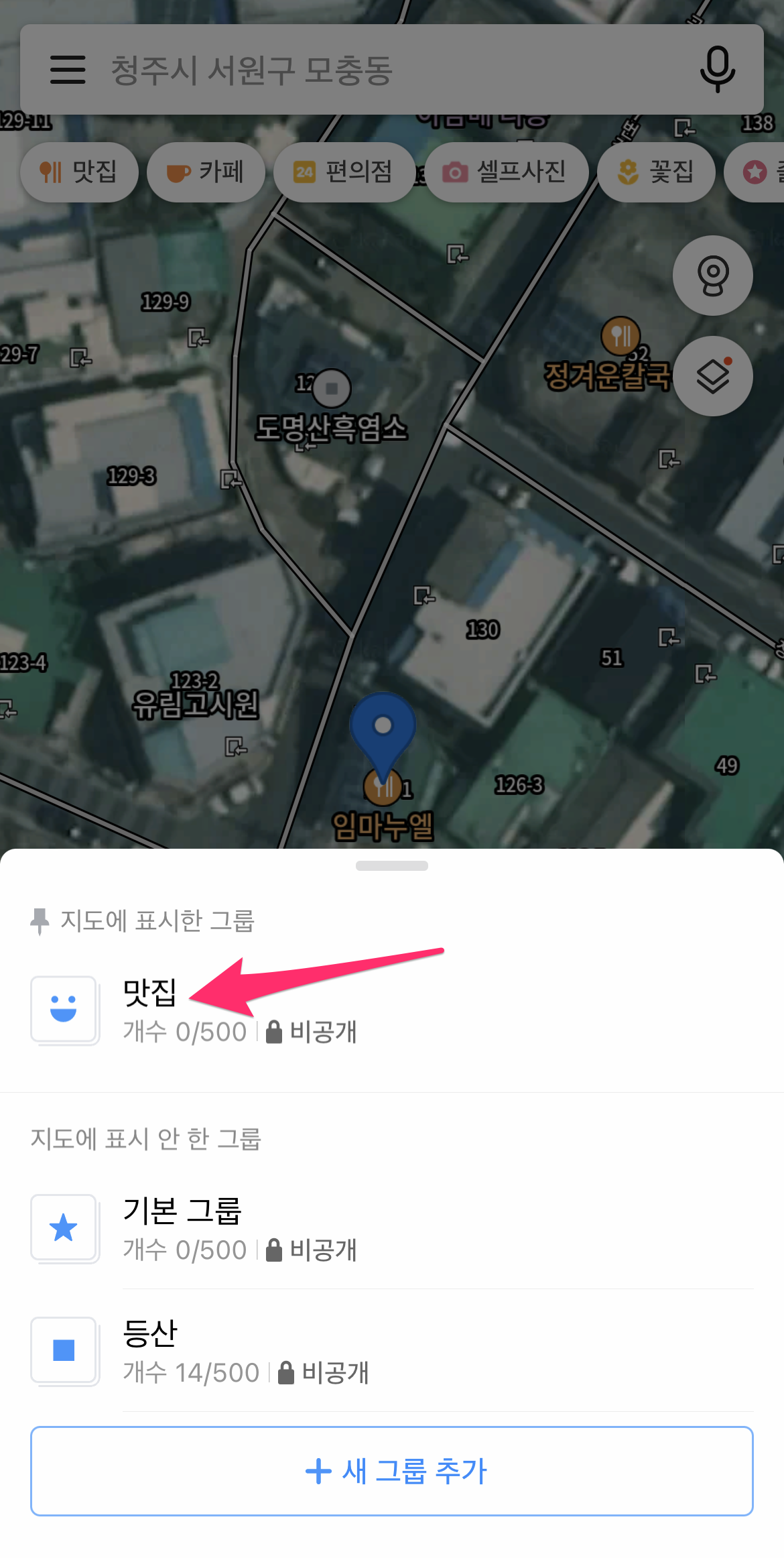 이제 즐겨찾기 목록에 방금 추가된 맛집 그룹이 보입니다.