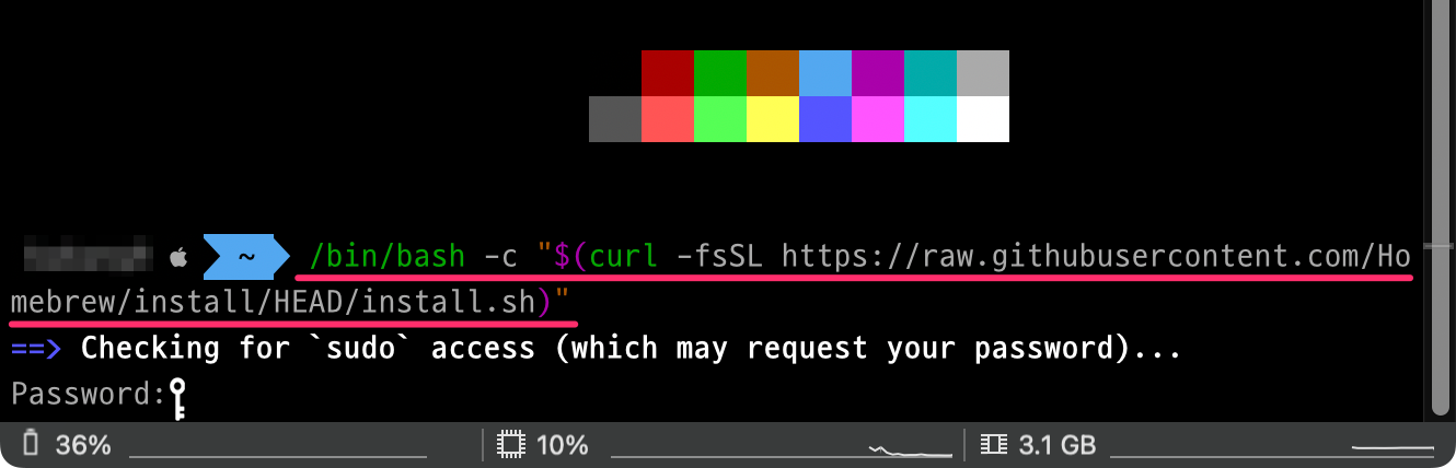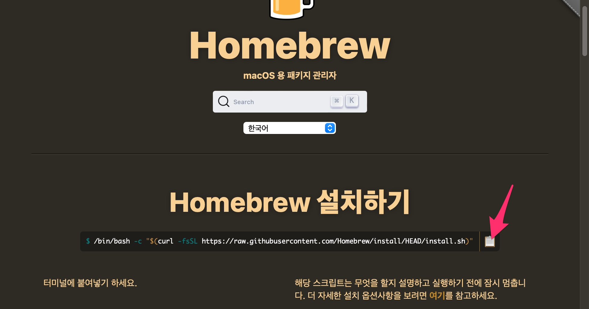 Homebrew 설치하기 문구 밑에 보면 터미널 명령어가 있습니다.