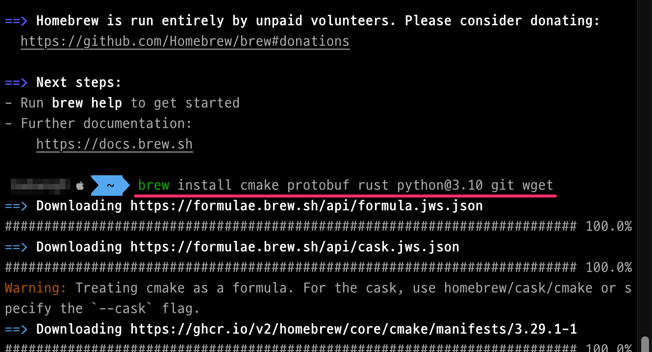 brew install cmake protobuf rust python@3.10 git wget